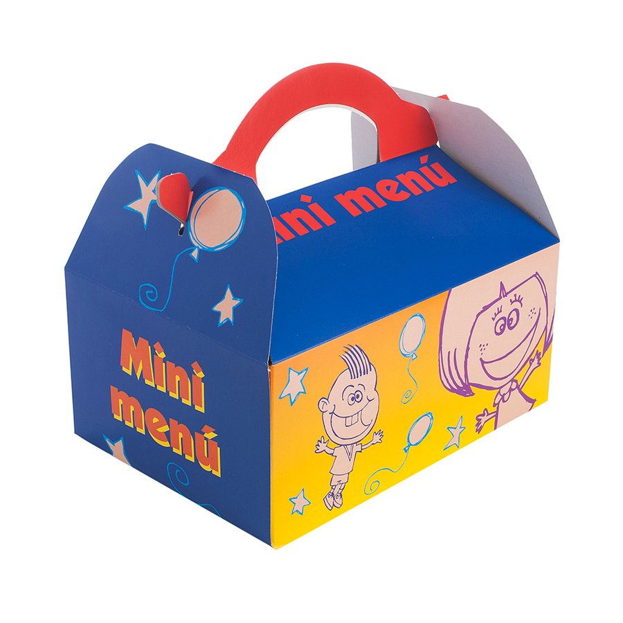 Boites de transport en carton, menu enfant avec décor , 220X160X100mm. Disposant de poignées de transport, cet emballage alimentaire recyclable est spécifique à la vente à emporter . Grâce au décor cirque , les professionnels de la restauration rapide apporteront une touche ludique à leur menu enfant…